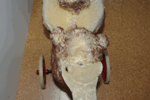 Der Plüsch von dem Steiff-Kamel auf Rollen zerschlissen und verstaubt.